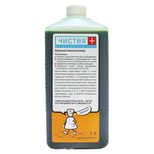 «Чистея плюс» - современное антисептическое средство, предназначенное для обработки операционного поля. Представляет собой жидкость зеленого