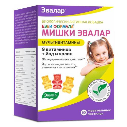 Пастилки «Бэби Формула Мишки Мультивитамины» от компании «Эвалар»: Отличаются качественным составом: созданы на основе европейских ингредиентов высокого качества. Содержат в составе натуральный сок (яблочный). Полное отсутствие искусственных красителей, ароматизаторов и консервантов. Без глютена и ГМО. Усиленный состав: богатый набор витаминов усилен минералами. Приятный вкус: детям нравятся мармеладные витаминки с фруктовым вкусом. Выгоднее по цене на 70 % по сравнению с импортным аналогом1. Высокое качество гарантировано международным стандартом GMP. Бэби Формула Мишки Мультивитамины получили Знак Качества «Лучшее - детям»2. Выпускаются как в маленькой (30 пастилок), так и в экономичной большой упаковке (60 пастилок).